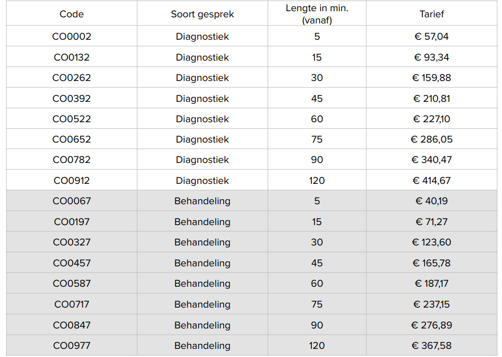 In dit document staan mijn tarieven. Ik hanteer de tarieven zoals opgesteld door de Nederlandse Zorgautoriteit. Deze tarieven komen uit het document “Tariefbeschikking Geestelijke Gezondheidszorg en Forensische Zorg TB/REG-26608-04”. Bij verschil tussen dit document en de door de Nederlandse Zorgautoriteit vastgestelde tarieven, is het laatste leidend. Indien de Nederlandse Zorgautoriteit de tarieven voor 2026 wijzigt, dan vervallen de tarieven uit dit document.